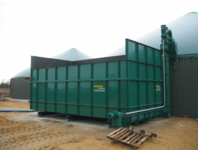 Delivery to the digester is performed by a vertical spiral conveyor screw that transfers the biomass to an inclined digester screw. This feeds the substrate into the digester safely below the level of the liquid. Of course, it is also possible to feed 2 digesters.